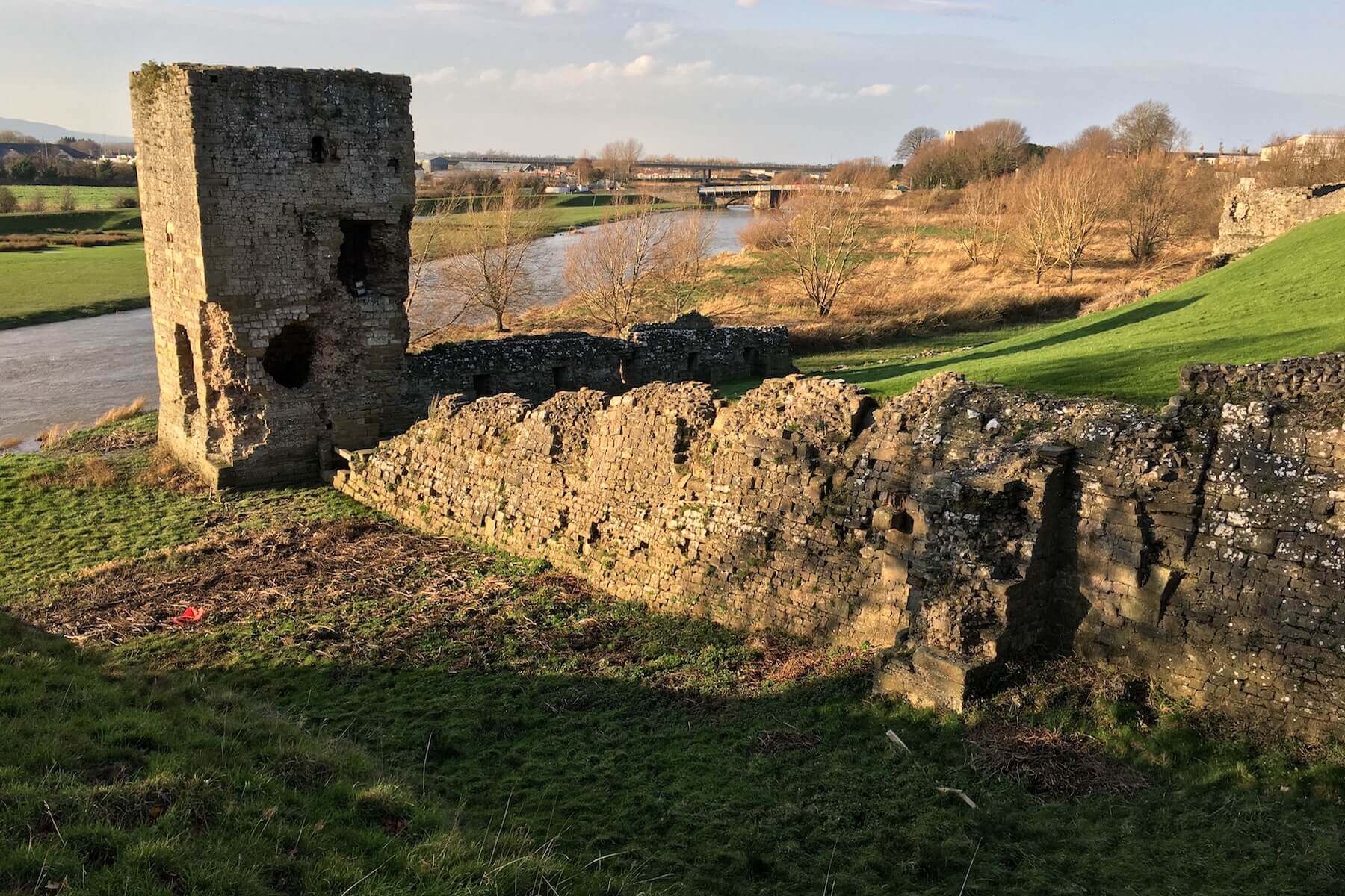 Located to the southwest of the castle, is the clearly discernible Gillot’s tower. This is believed to be where access was provided from the river to the castle through a water postern, providing one of the castle’s four access points via a dock where ships could load and unload supplies and men. The u-shaped enclosure of the dock was composed of solid masonry walls, with a rubble core, which acted as a retaining wall to earth behind. Unfortunately much of the faced stone has been lost on the side furthest from the castle, but a large amount remains on the nearest side of the enclosure, allowing visitors to clearly see the make-up of the docksides and even discern the methods of construction where the rubble core is exposed.