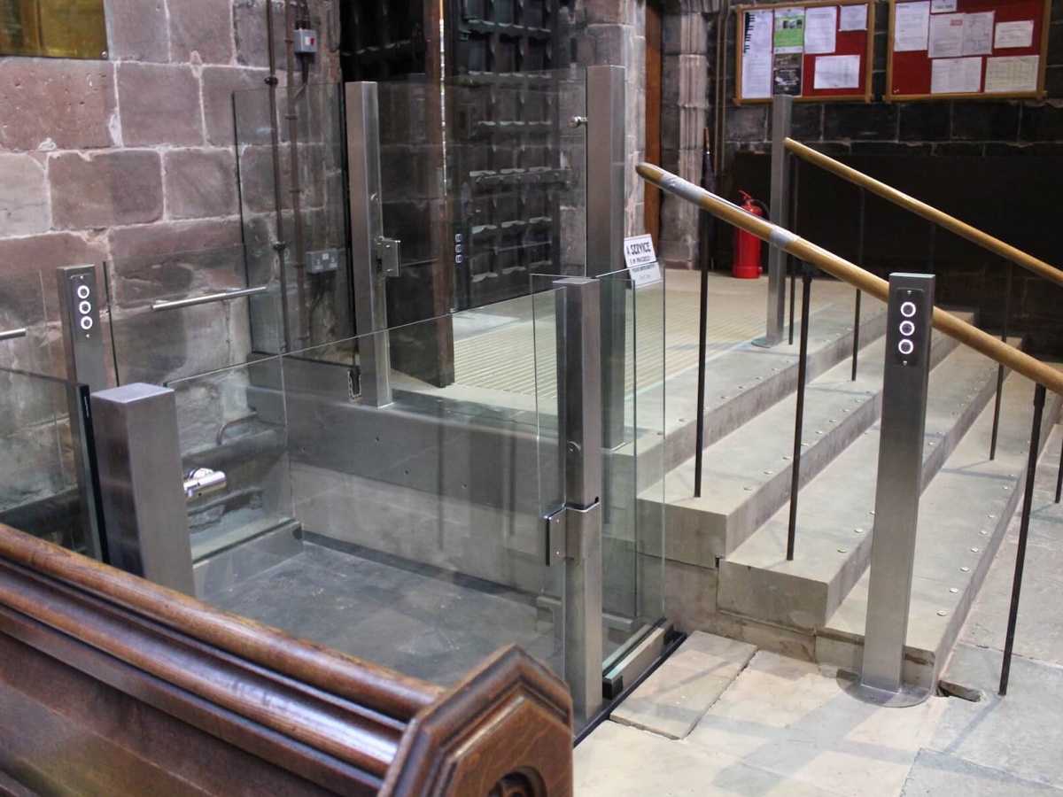 Disabled access to the church was improved throughout, with floors being raised to eliminate steps, and the addition of a new glass platform lift at the south entrance paved in York stone flags to carefully blend the old and new together. To help the new contemporary lift blend more seamlessly into the beautiful setting, the platform was paved with York stone flags, providing a flowing continuity of the original materials. Disabled access was also improved to the north and south transepts, through the replacement of temporary ramps with permanent stone ramps, again providing continuity of the historic York stone flags, allowing a more permanent and aesthetically sympathetic solution to the access problem.