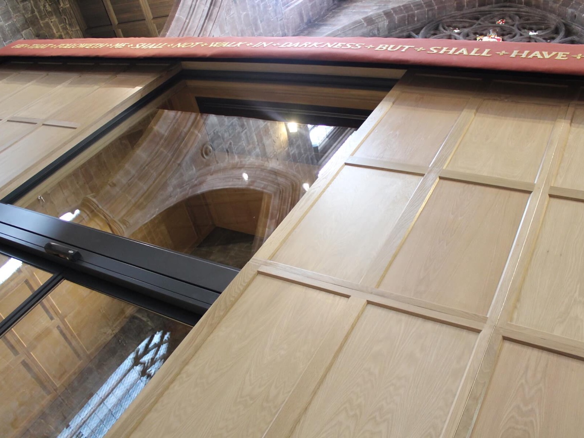 A glazed lobby, with state of the art automatic glass doors, was constructed to let light shine into the building and allow the historic west doors to be kept open during the day. This helps to encourage visitors to explore the magnificent church, offering a framed view into the church from the town. The modern glazed lobby is set within a specially constructed oak-panelled screen, the West Screen as it has been named, which offers a more traditional appearance. The resulting juxtaposition helps to prevent a clash between the contemporary design and the historic building fabric and captivating stained glass west window. Encapsulated within the oak-panelling, Recclesia created high-quality modern toilet facilities on the ground floor, with storage rooms above, allowing the church to be used with greater flexibly.